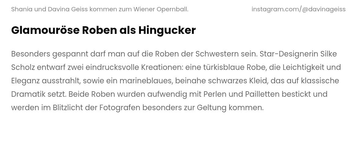 Der Wiener Opernball stellt mit seinem strengen Dresscode höchste Anforderungen an die Abendgarderobe. Für das Debüt von Shania und Davina Geiss entstanden in unserem Atelier zwei Roben, die diese Tradition mit moderner Schnittführung verbinden.